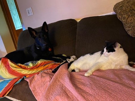 Es geht ihm gut ,wie die Bilder belegen. Er lebt mit noch einem Hund und einer Katze im Haus.